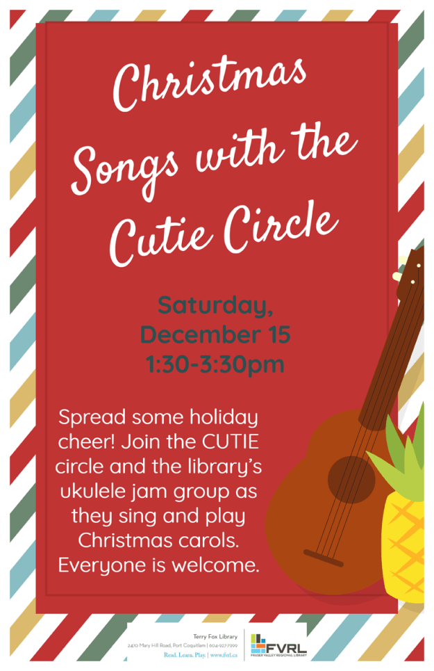 Spread some holiday cheer by joining the Cuties and the Terry Fox Library’s ukulele jam group as we sing and play Christmas songs. Everyone is welcome.