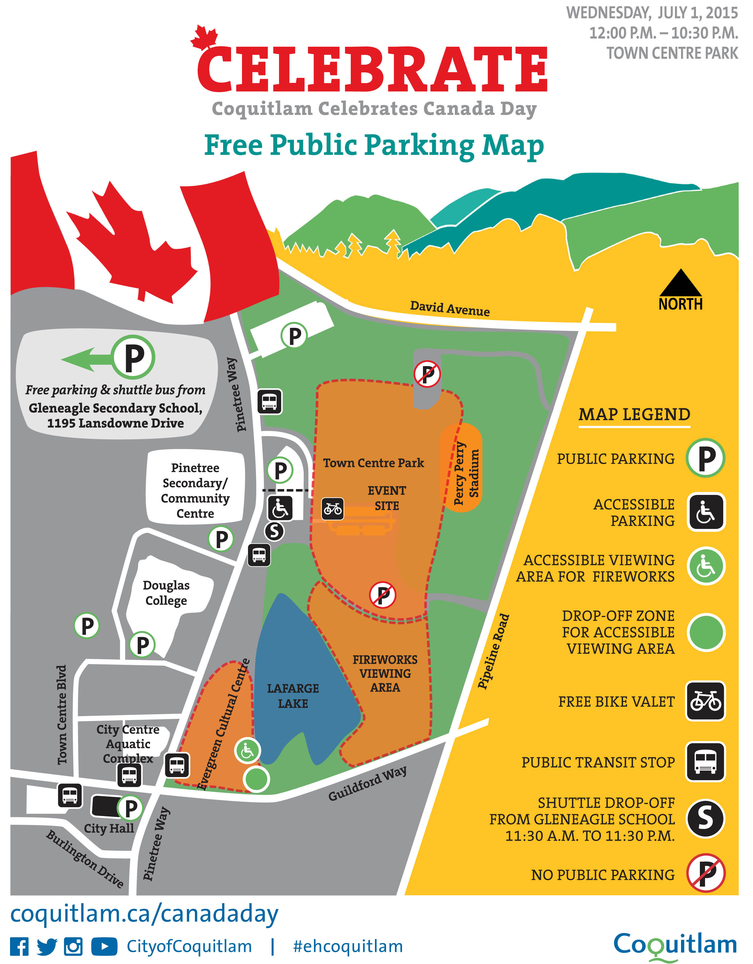 A free shuttle bus will run from Glen Eagle Secondary School from 11:30am to 11:30pm. View the parking map below for a list of free public parking in the area.